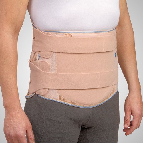 Corsé rígido bivalvo sacro-lumbar. Placas de termoplástico conformadas lumbosacra y abdominal. Aceros conformables laterales.