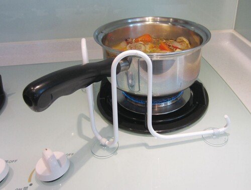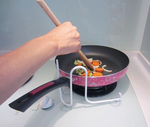 Este pequeño utensilio puede ser colocado en la encimera o en la placa de cocción para sostener el mango de una sartén.